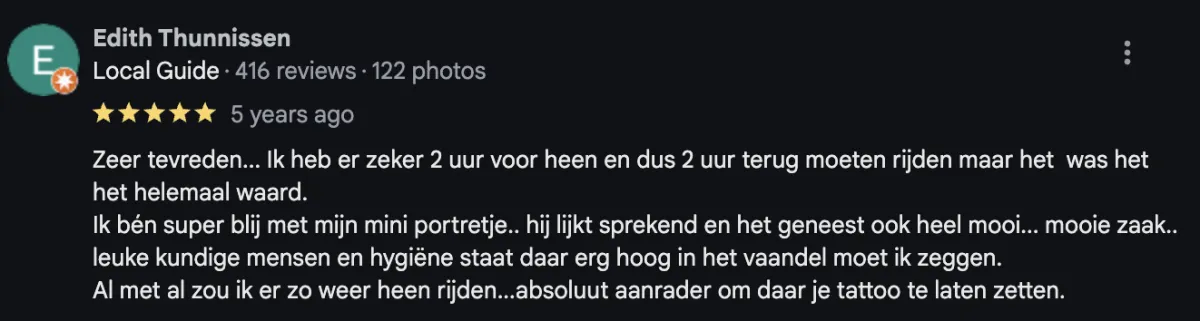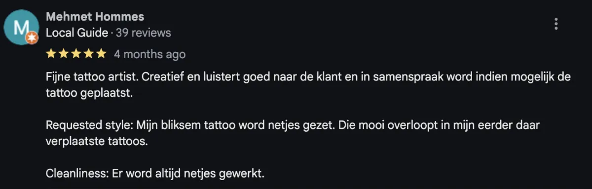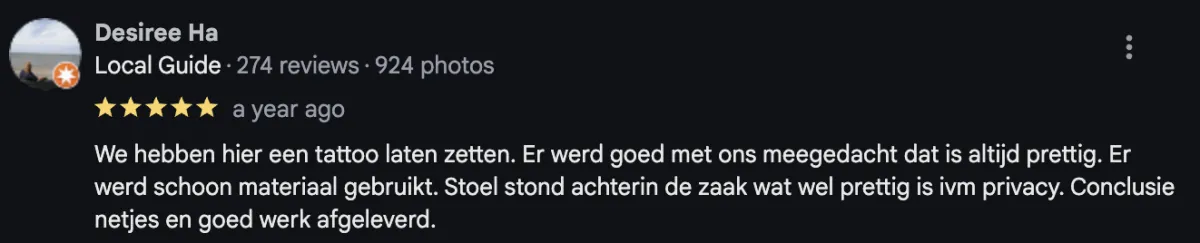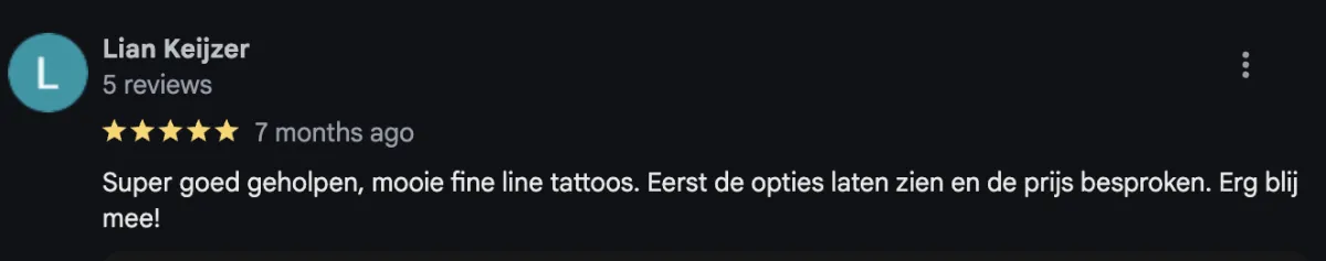Wanneer je bij ons in de studio komt, beantwoorden we graag al je vragen, maken we een plan, regelen we je boeking en zorgen we ervoor dat je op de best mogelijke manier wordt voorbereid op je tatoeagesessie.